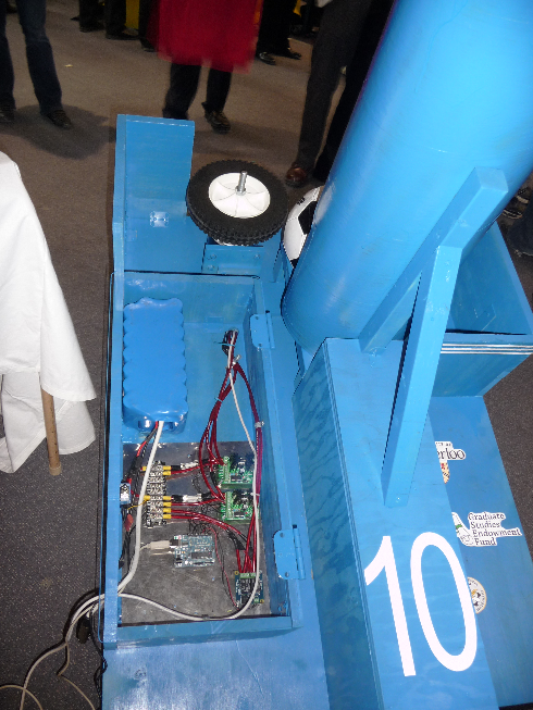 The electrical design can be broken down into 3 main sections; the microcontroller, the speed controllers, and the actuator controller. 1. The Microcontroller The microcontroller is necessary to precisely control the speed and actuator controllers, while allowing connectivity to a computer for software purposes. The microcontroller must be capable of being powered via USB or an external source. KickLogic’s solution: use an Arduino Duemilanove with a 328 Mega chip to control the motor speed signals, as well as the actuator relays. The Arduino board has 13 output pins and is capable of sending pulse-width modulation (PWM) signals which may be used for the speed controller. ![]() 2. The Speed Controllers The speed controllers must be capable of handling a 36V source, while being controlled via 5V inputs. Although motors will be rotating in opposite directions, bidirectional control is not necessary. KickLogic’s solution: Using two Critical Velocity 15A PWM motor speed controllers provided ample control over motor speeds and interfaces well with microcontrollers. With the ability to handle 36V inputs, this proved to be the perfect match to the motors that have been previously selected. ![]() 3. The Actuator Controller For the linear actuator to function properly, a controller is required to manage the direction of voltage running through the actuator. The controller must be capable of transferring up to 12V and 2A. KickLogic’s solution: Instead of using a controller, it was found to be more cost effective and more efficient to use two relay switches to control the actuator voltage. By implementing a simple circuit, the need for a costly controller was avoided. ![]() The Final Product Similar to the Mechanical and Software components, a lot of time and effort was put into taking the electrical components of the FTM from their design phase to their final product phase. And the hard work paid off! ![]() Top-view image of the completed electrical assembly on the FTM ![]() Top-view (zoomed) of the completed electrical assembly on the FTM |