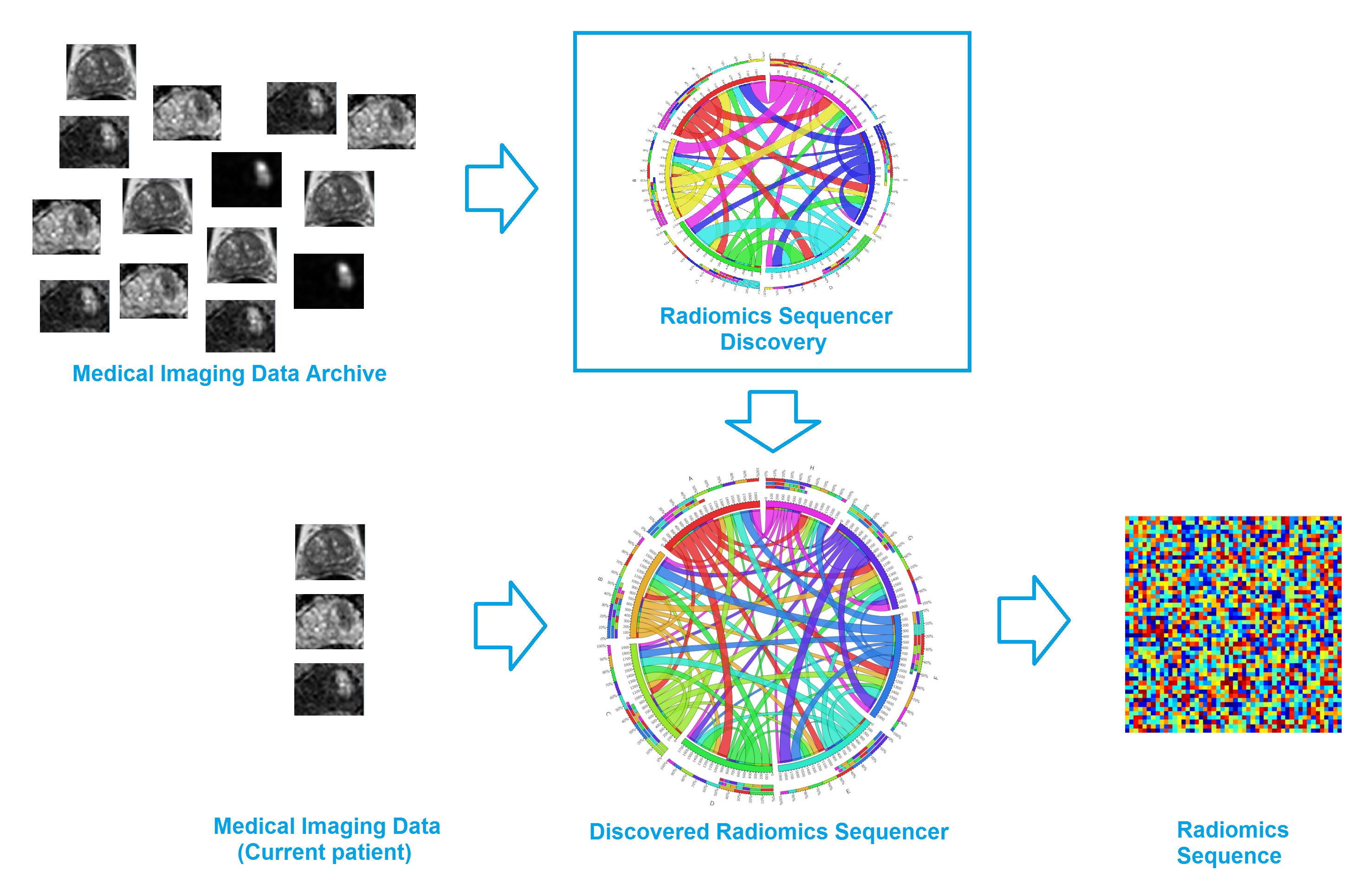 The discovery radiomics framework consists of the following steps (see Figure above). First, a wealth of standardized medical imaging data from past patients are fed into the radiomics sequencer discovery engine, where a customized radiomics sequencer is constructed based on a large number of radiomics features that were discovered to capture highly unique tumor traits and characteristics. Second, for a new patient case, the discovered radiomics sequencer is then used to extract a wealth of customized, tailored imaging-based features from the medical imaging data of the new patient case for comprehensive, custom quantification of the tumor phenotype.