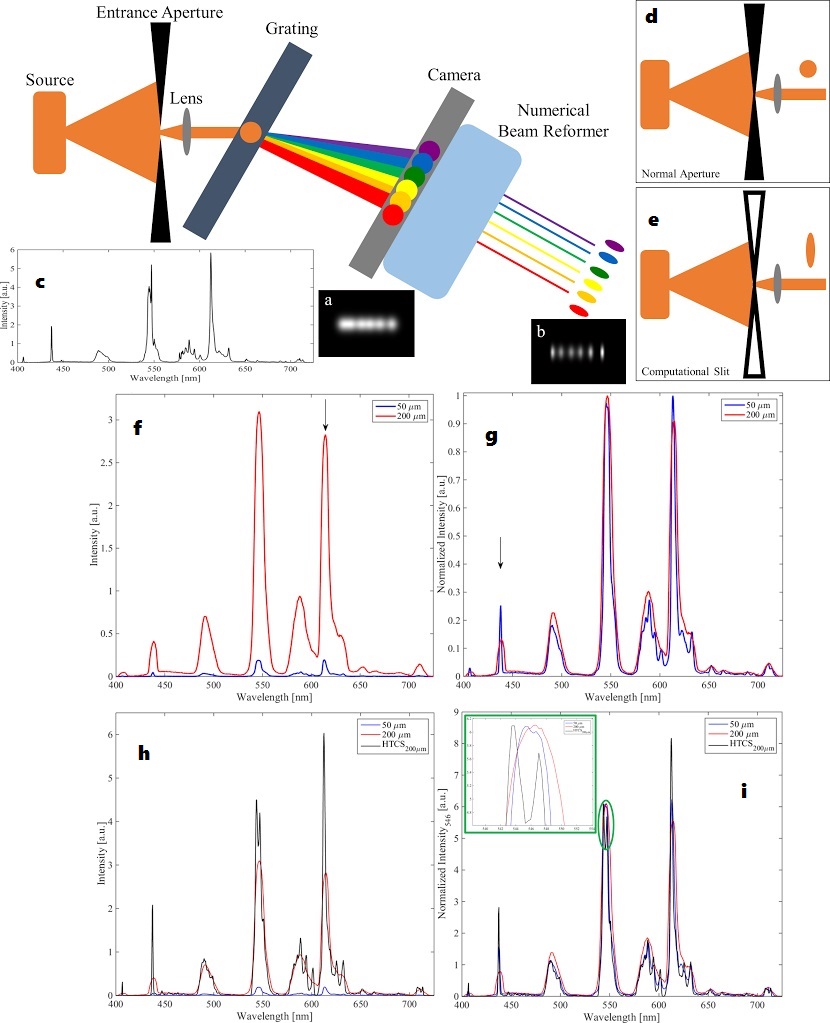 Overview of high-throughput computational slit (HTCS). The systems design of a generic spectrometer is shown here augmented with the proposed HTCS. Pictorial representation of the beam shape demonstrate how the HTCS system operates by changing the morphology of light that has entered from a much larger entrance aperture (a)to increase the spectral resolution of the spectrometer by imposing a small-slit function(b). (c) The high-resolution spectrum of the light source used for this study, Mercury vapor fluorescent lamp captured using a 10 µm entrance aperture. (d) Shows the imaged spot morphology after the light propagates through a normal aperture. (e) Shows the imaged spot morphology after the light propagates through the proposed HTCS. (f) The spectra of the light source at one second exposure time using a 200 µm and a 50 µm entrance aperture used for light throughput comparison. It is noted at the marked wavelength of interest, 613 nm, the peak signal is > 14 times larger using the larger entrance aperture. (g) The normalized spectra of the source using a 200 µm and a 50 µ m entrance aperture used for spectral resolution comparison. It is noted at at the marked wavelength of interest, 438 nm, the spectral resolution is > 4 times higher using the smaller entrance aperture.