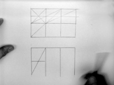 From the top right corner, draw a diagonal line to meet with the left vertical edge. The diagonal should pass through the midpoint of the bottom side of the unit square