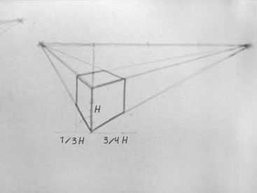 Draw the back faces. Here is a well proportioned cube with its front edge at the 1/4 point of the horizon.