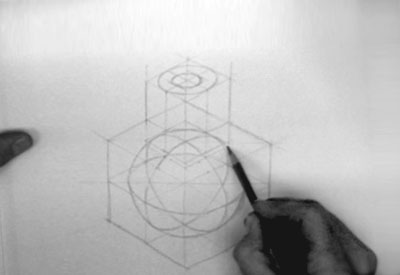 At this depth, sketch an enclosing square to contain the bottom face of the cylinder. This gives the precise location of the intersection between the sphere and the cylinder.