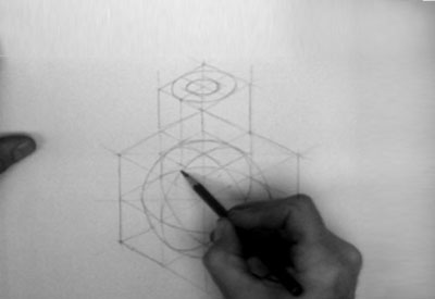 Now we need to find the depth at which the cylinder intersects with the sphere. From the midpoints of the top face of the cylinder, project vertical lines down until they intersect the vertical ellipses of the sphere.