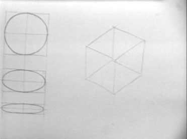 In pictorial views, circular features show up as ellipses contained in a diamond. To sketch ellipses in pictorial views, the same technique is used. First construct an enclosing cube.