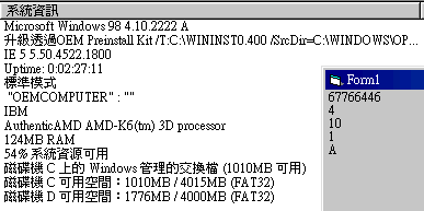 最後,您會看到用一些傳回值,看看系統資訊,有些數值正好和第一行的數值一樣,因此我們就可以憑著dwPlatformId、dwMajorVersion和dwMinorVersion查出系統是甚麼形號了!以下是一些資料,但不齊全,希望各位看過本文的網友提供!