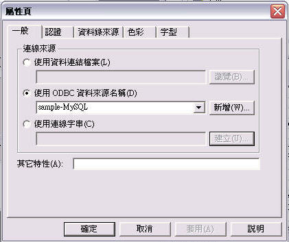 選使用ODBC資料來源名稱,選sample-mysql(不過好像你要預先設定好myodbc)