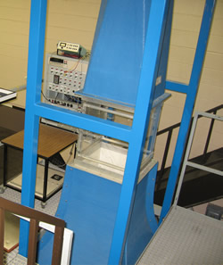 The vertical wind tunnel has a 45 cm x 45 cm x 60 cm (18 in. x 18 in. x 24 in.) test section and is capable of airflow velocities from 1 to 12 m/s. The contraction has a 6.25:1 area ratio, with a symmetric cross section and analytically developed contours. The primary diffuser section expands with a total included angle of 6 degrees. The inlet section includes an aluminum honeycomb section and graduated mesh, high porosity screens providing a velocity variation in the test section of less than 1% variation from the mean, free stream velocity. Airflow velocity is controlled by a transistor invertor type variable frequency controller and velocity measurements are made using a hot wire and/or vane anemometer. Thermocouple temperature readings and resistive heater power levels are measured, recorded and controlled using a Keithley data logger