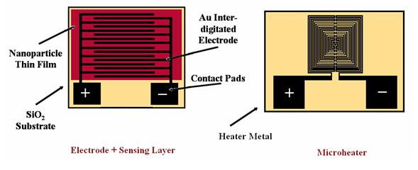 The final device consists of two main components. The first is a microheater, which is included due to the fact that temperatures in the range of 100-500°C are required for these chemical reactions to occur. The microheater is able to heat the local area of the chip using very little power, and without perturbing other sensors in the vicinity. The second major component is the microfabricated electrode, on top of which the nanoparticle material is deposited by spin coating. Below is an example of an electrode/sensing layer and a microheater. The two devices are separated by a thin SiO2 layer, allowing thermal conductivity and electrical insulation between the heater and the sensing layer above it. The entire device is fabricated on a silicon substrate with a deposited SiO2 layer.